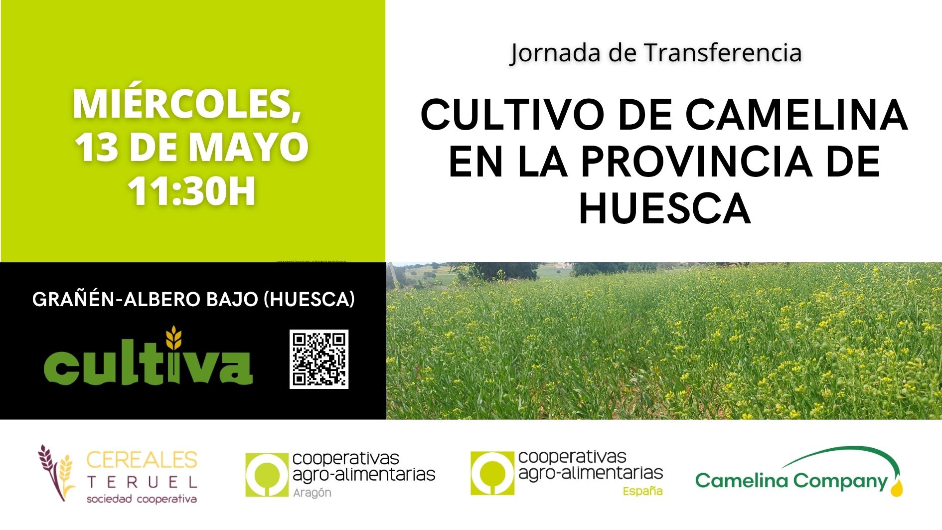CULTIVA 2026, que tendrá lugar los días 13 y 14 de mayo de 2026 en Grañén-Albero Bajo, en Los Monegros, incluye en su programación una jornada relativa al cultivo de la Camelina. Se desarrollará en la mañana del 13 de mayo, a las 11:30 horas. Esta sesión tiene como objetivo “acercar a agricultores y técnicos las oportunidades que ofrece este cultivo emergente, así como compartir experiencias prácticas sobre su implantación y manejo”. Cooperativas Agroalimentarias de Aragón y Cereales Teruel presentarán los avances y resultados obtenidos en el proyecto europeo CARINA. La empresa Camelina Company, por su parte, abordará los principales aspectos agronómicos de este cultivo, incluyendo recomendaciones técnicas para su desarrollo en condiciones mediterráneas.
