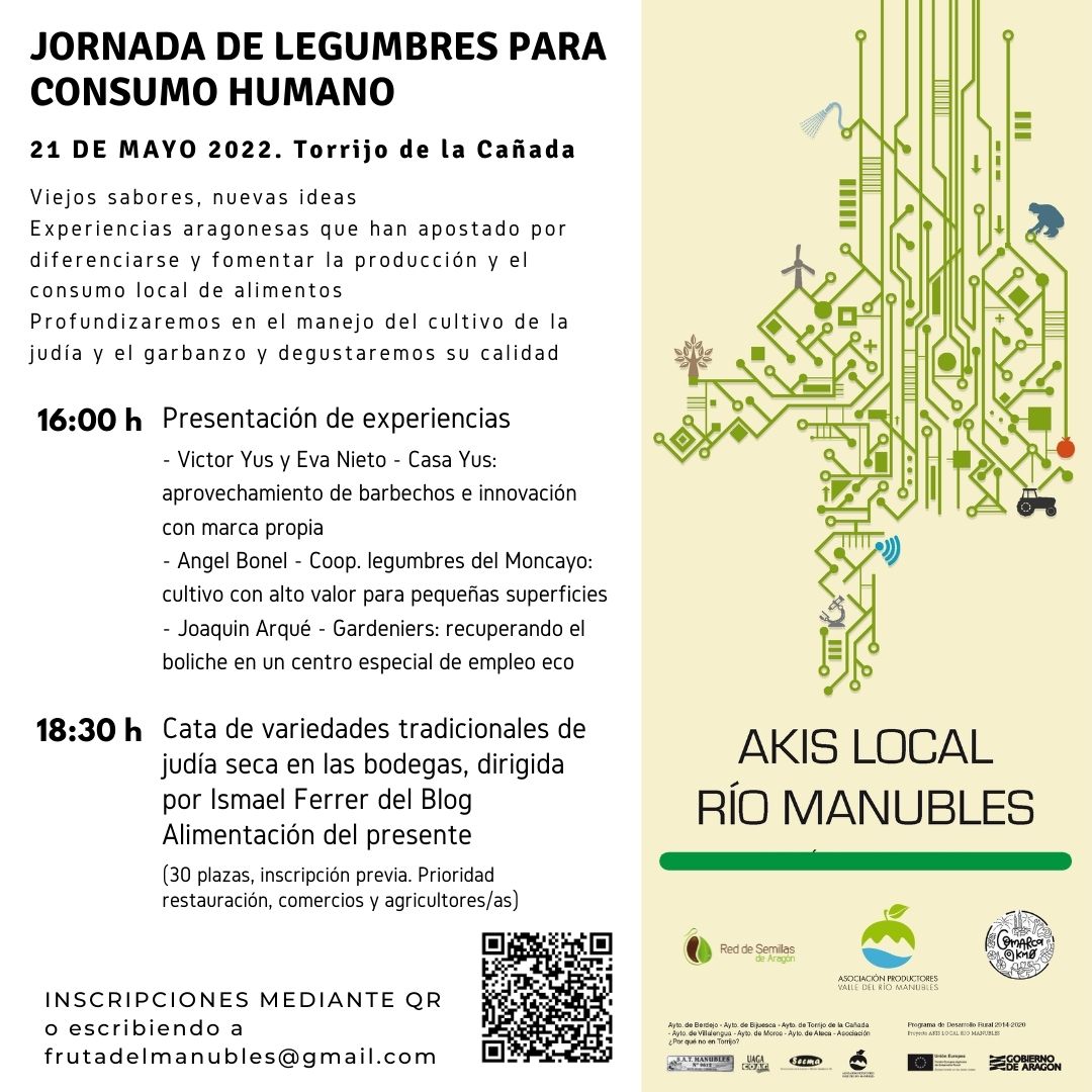 El Akis Local Manubles ha organizado una jornada para el fomento del cultivo de legumbres de consumo humano. Tendrá lugar el 21 de mayo en horario de tarde en Torrijo de la Cañada (Zaragoza). Se presenta como “un encuentro entre agricultores con el fin de redescubrir el cultivo de las legumbres, como la judía y el garbanzo, de la mano de profesionales aragoneses con experiencia en su manejo”. Habrá una mesa redonda con participación de Legumbres del Moncayo, Casa Yus y Gardeniers. Se llevará cabo también “una cata dirigida de judías para analizar las diferentes calidades según variedad y establecer vínculos con los comercios y restauración local”. Intervendrá el cocinero y divulgador gastronómico Ismael Ferrer. Explicará “la importancia de consumir variedades locales y guiará a los participantes con el fin de analizar los matices singulares que podemos encontrar en diferentes variedades de judía seca”.
