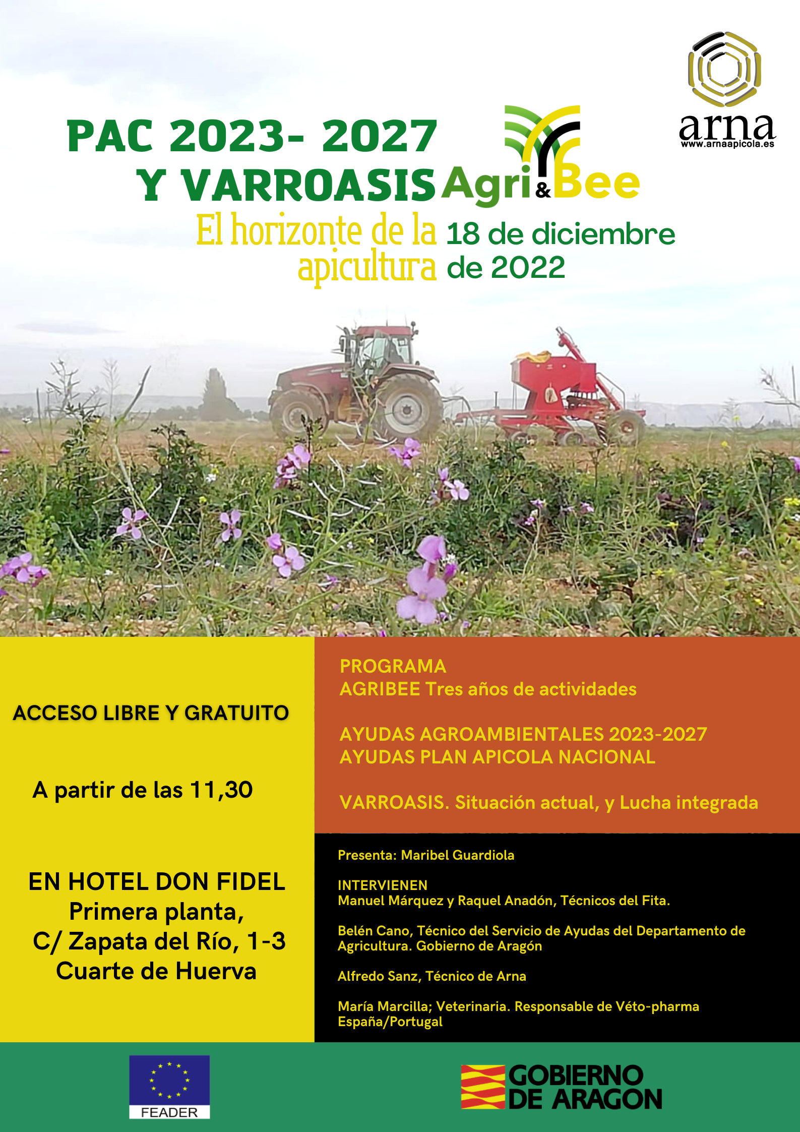 La Asociación Apícola Aragonesa ARNA ha organizado para este domingo, 18 de diciembre, a las 11:30 horas una jornada informativa que lleva por título “PAC 2023-2027 y varroasis. El horizonte de la apicultura”. Se celebrará en el hotel Don Fidel, en Cuarte de Huerva (Zaragoza).
