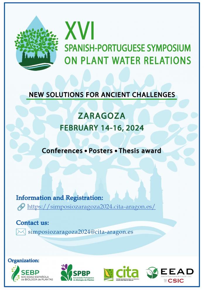 El XVI Simposio Internacional Hispano-Portugués de Relaciones Hídricas en Plantas se celebrará en Zaragoza del 14 al 16 de febrero. La organización corre a cargo de la Sociedad Española y Portuguesa de Biología de Plantas, el CITA de Aragón y la Estación Experimental Aula Dei del CSIC. El lema elegido es “Relaciones hídricas en plantas: nuevas soluciones para antiguos desafíos”. Las sesiones tendrán lugar en el CaixaForum de Zaragoza y abordarán “las relaciones hídricas en vegetación natural, los aspectos genéticos y moleculares de las relaciones hídricas en plantas y el estrés hídrico en cultivos, así como nuevas metodologías para el estudio de las relaciones hídricas y aspectos relacionados con el movimiento de agua en plantas”.